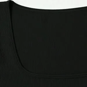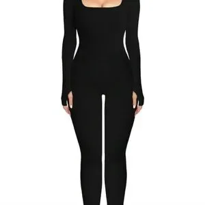 Sleek black ribbed jumpsuit with long sleeves. Perfect for any occasion.