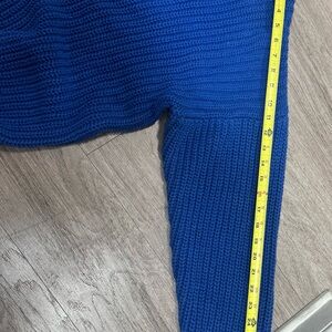 Cozy blue knit sweater with a classic design. Material has lots of stretch. See images for measurements.