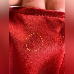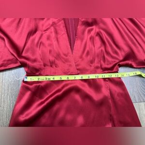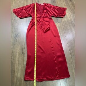 Elegant red silk midi dress. Features deep V-neck and wrap style. Perfect for evening wear.