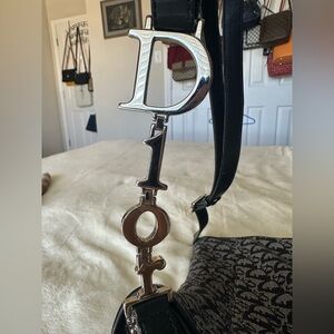 Crossbody leather strap is adjustable but not removable, has superficial scratches and wrinkling but no cracks or signs of breakage. Has Dior engraved hardware in one end. Drop length 24”