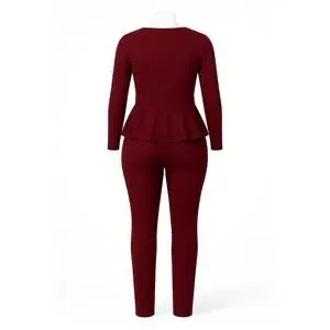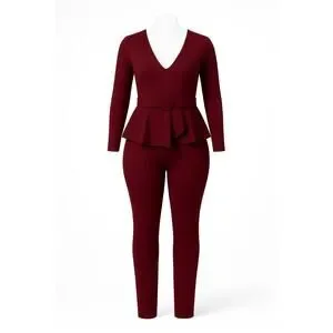 Make a statement in this stunning wine burgundy jumpsuit by GIBIU. Featuring a deep V-neckline, long sleeves, and a waist-cinching peplum with a covered buckle belt, this piece blends sophistication with curve-flattering design. The sleek straight-leg pants balance the dramatic peplum, making it perfect for evening events, date nights, or special occasions.