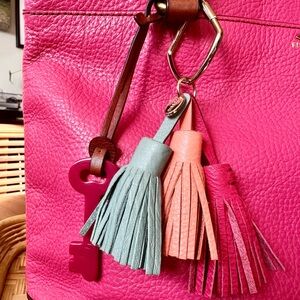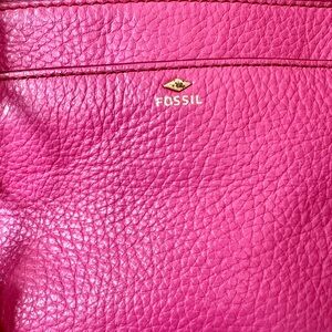 Genuine pebbled leather in a bright pink with brown trim and gold hardware. Zip top closure with an exterior pocket and roomy interior (zip + slip pockets). Comes with the Fossil key and tassel charm.