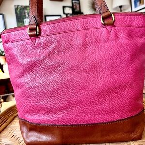 Fossil Sydney Pink Pebbled Leather Zip Tote Brown Trim