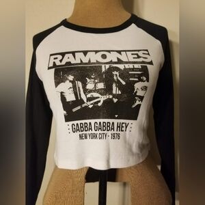 Ramones Punk Band Cropped Ringer Tee Long Sleeve Made by Pull & Bear. Size Medium (Size 8). This cropped tee features a baseball ringer style design in black and white. Shirt reads Ramones, Gabba Gabba Hey, New York City 1976. Slight wear to front print. Sold out online. Licenced by The Ramones circa 2022. Cotton material.