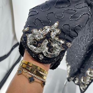 Elegant vintage SCALA 100% silk beaded and sequin evening jacket in classic black with stunning silver and gold beadwork. Beautifully designed with an open front, single hook-and-eye closure, structured shoulder pads, and scalloped beaded trim. The perfect statement layer for parties, weddings, formal events, cocktail attire, or anytime you want a little extra sparkle.