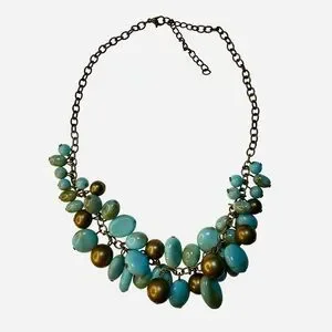 Bold, eye-catching statement necklace featuring glossy turquoise blue beads paired with rich bronze-tone accents on an antique-style chain. The clustered design creates beautiful dimension and movement.