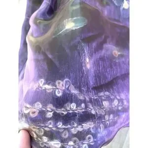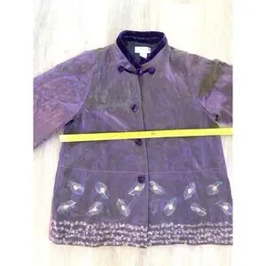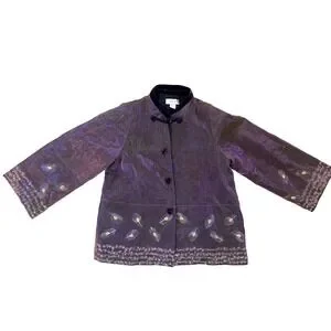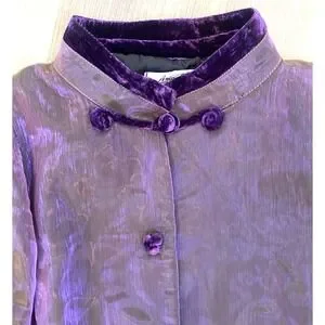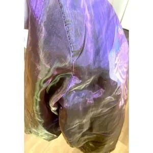 Top has sheer iridescent layer over embroidered design with velvet snaps and collar. pre-owned good condition with no known issues