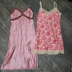 Luxurious pink satin chemise with brown lace trim. Red patterned chemise with cream lace accents. Perfect for a stylish night's sleep.