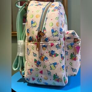 Loungefly Disney Lilo & Stitch Vacation Vibes Mini Backpack. It features a tropical-themed all-over print on a cream-colored faux leather background, showcasing the characters Stitch and Scrump enjoying various vacation-related items like tropical fruits (including watermelon and pineapple) and refreshing drinks.