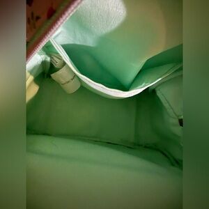 Design: A vibrant "Vacation Vibes" pattern with mint green accents on the straps, zippers, and the official Disney x Loungefly logo plaque.