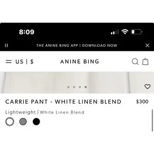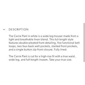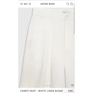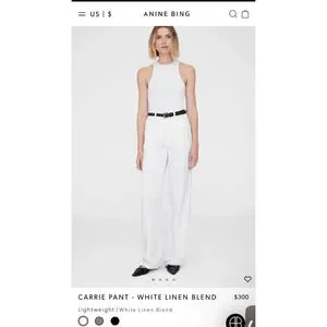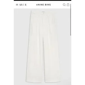 The pre-owned excellent PRELOVED condition (worn once)Anine Bing Carrie Pant is a white, wide-leg trouser made from a lightweight linen blend. It features double-pleated front detailing, five functional belt loops, slanted front pockets, and a single button zip-front closure. The material composition is 35% Lyocell, 32% Linen, and 33% Rayon. The pants are fully lined and have a high-rise fit. The bottoms show some darkening from being long and dragging in ground.