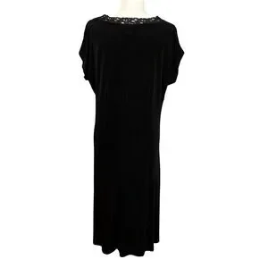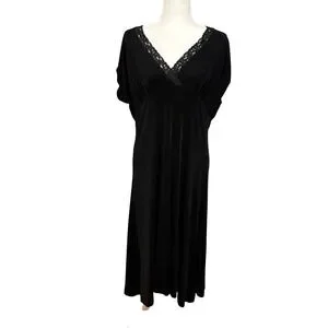 Keywords: black midi dress, lace v neck dress, chicos travelers, acetate spandex dress, comfortable dress, travel dress, elegant dress, classic black dress, women's dress, black dress, midi dress, lace trim dress, size 3, designer dress, versatile dress