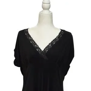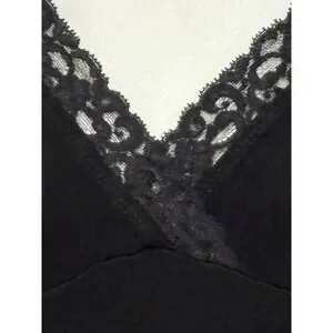 Unleash effortless sophistication with this captivating black midi dress. Delicate lace trim graces the flattering V-neckline, adding a touch of refined elegance. The comfortable, flowing silhouette drapes beautifully, creating a sleek and stylish look. This dress promises a figure-flattering fit that moves with you, making it ideal for all-day wear. With its timeless design and comfortable fabric, it is the perfect choice for a sophisticated dinner, a relaxed weekend brunch, or a stylish travel outfit.