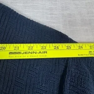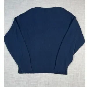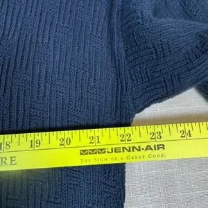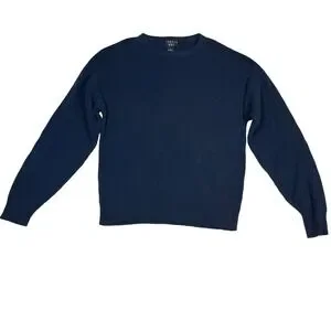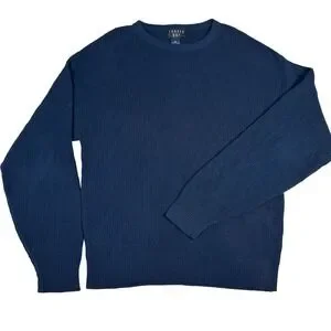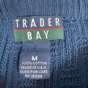 Keywords: Trader Bay sweater, Men's knitwear, Textured sweater, Crew neck pullover, Blue cotton sweater, Size M sweater, Made in USA clothing, Casual men's fashion, Geometric knit, Long sleeve sweater, Comfortable sweater, Layering piece, Weekend wear