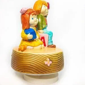 1970’s vintage music box featuring a happy Moppets’ style boy and girl playing with toys. Music is The Candy Man.