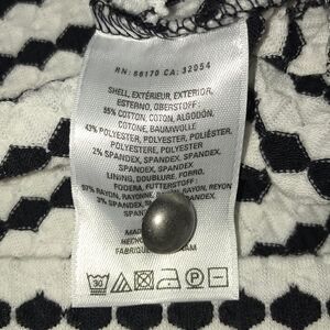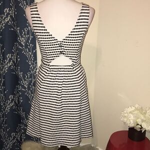 Great, preloved condition. Anthropologie | Maeve Cut Out Dress. Black and white. Textured geometric pattern. Faux Button detail on the back. V-neckline. Fit and flare skater style dress. Slight color transfer under the arms.