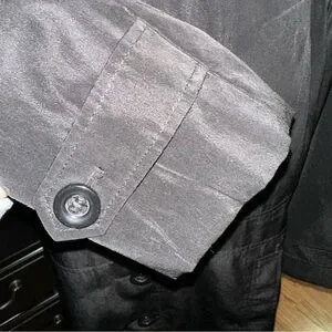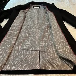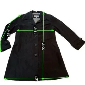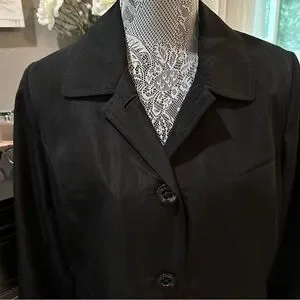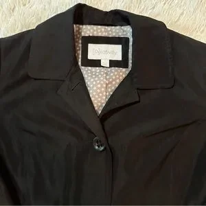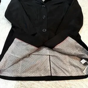 Classic and versatile Relativity black trench coat in women’s size Large. Features a button-front closure, spread collar, and tailored seams for a flattering fit. Fully lined with a fun polka dot interior and subtle red trim accent.
