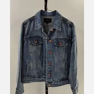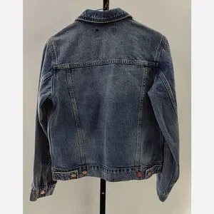 Stylish blue denim jacket with button closure. Features front pockets and classic design.