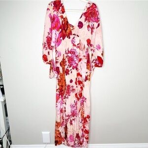 Elegant floral maxi dress featuring vibrant pink and red hues. Perfect for a beach outing or sunset stroll.