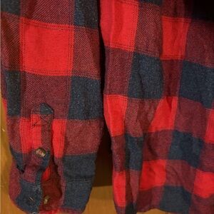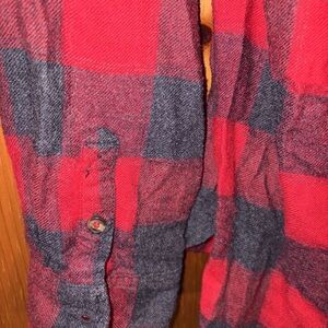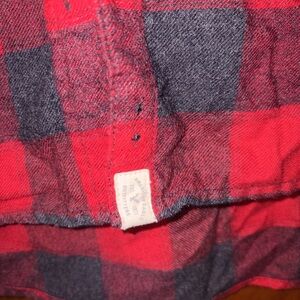 Casual red and gray plaid shirt. Features a comfortable fit and classic design.