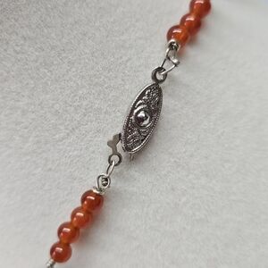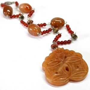 Gorgeous vintage carved carnelian beaded necklace. Large pendant with an animal that appears to be an owl on top. Silver-tone hardware. Fish hook clasp close. 15" long - pendant is about 1.5" long. Purchased from an estate and no visible maker's mark. Excellent condition and smoke-free home.