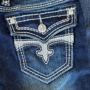 Rock Revival Madison Straight Leg Jeans-Women’s Size 27. Dark wash with contrasting fade and heavy stitching. 5 pocket design with back flap pockets embellished with white sequin bling accents. Fleur de lis pattern on buttons. These are in great preowned condition with no flaws. Always cared for meticulously.