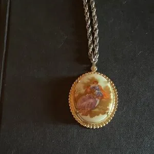 Vintage Beautiful oval Gold romantic lady purple painting Pendant Necklace scene
