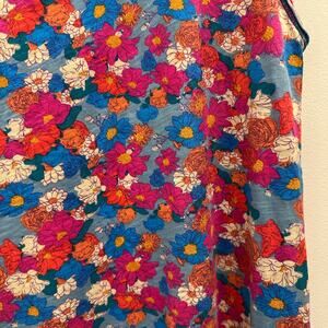 Features: Relaxed t-shirt dress silhouette with sleeveless tank cut and scoop neckline; flowy midi-length hem ideal for layering; lightweight breathable stretch jersey knit; bold multicolor floral print with retro daisy and rose motifs; dual side pockets; finished with contrast serged seams for a handmade look; easy pull-on design with roomy fit.