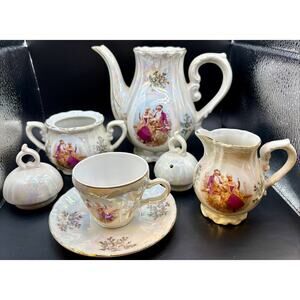 * Design: The set features a distinctive pearlescent or lusterware glaze and a romantic transferware scene, often referred to as the "Fragonard Love Story" design.