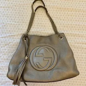 Elegant Gucci shoulder bag with metallic finish. Features iconic logo and tassel detail. Chain strap adds sophistication.another beautiful bag I have not used it is great condition no flaws, I need bag that has zipper opening. Has dust bag clean, sleek stunning bronze, gold Gucci shoulder bag price firm no offers please! In excellent condition