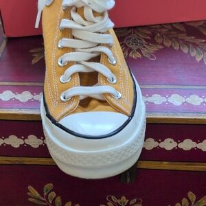 Mustard high-tops with white laces. Iconic Converse logo on the side. Mens 7 Women's 9 new in box .