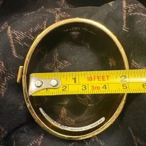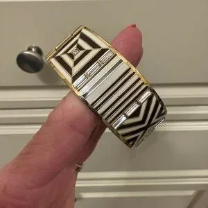 Stylish bangle bracelet with brown and white stripes. Gold-tone accents. Elegant and modern design.