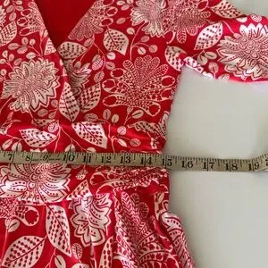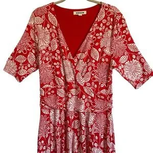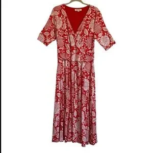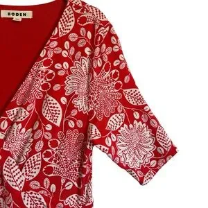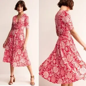 Boden Poppy Red Gardenia Jersey Midi Dress in size 10. This flattering wrap-style silhouette features a V-neck bodice with soft ruching, a defined waist, and a sweeping midi skirt that finishes at mid-calf. The bold red floral print makes it ideal for weddings, garden parties, work events, or elevated everyday wear.