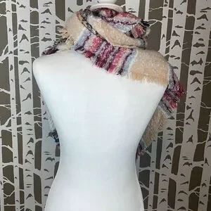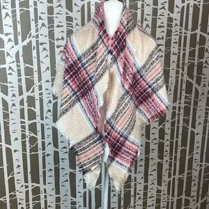 Sonoma Super Soft Plaid Print Fringe Trim Boucle Knit Triangle Scarf OS. Features super soft and cozy 100% polyester plaid print boucle knit in maroon, shades of pink, navy, cream, peach, white & black, fringe trim edges. Worn once with no flaws to note. Triangle shape reduces bulk in the back for very comfortable layering when tied in the back and worn like a bib scarf.