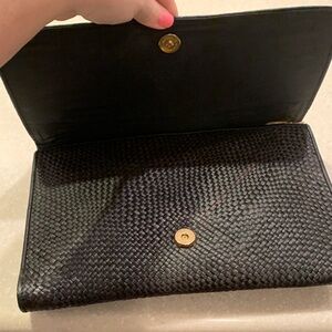 Stylish women's clutch featuring a vibrant multicolor leather criss cross pattern. Black straw background, front flip snap closure, inside hooks for shoulder strap and inside zipper pocket. Perfect for adding a pop of color to any outfit.