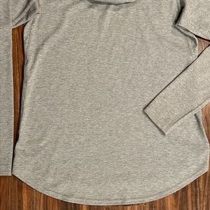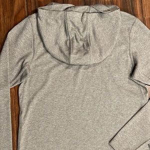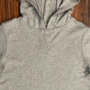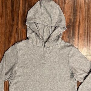 Soft, quick drying and durable hoddie shirt in heathered gray with rounded hem.