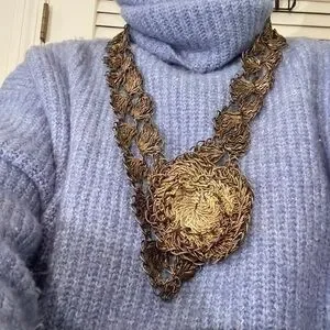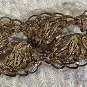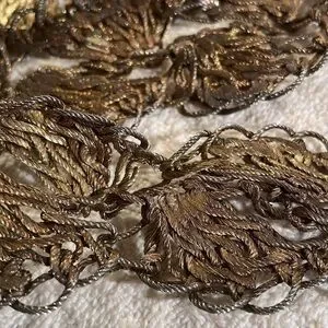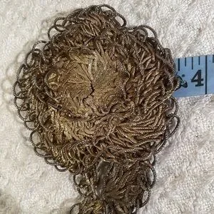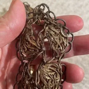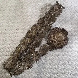 The amazing flattened wire cluster forms a sequential open flow to this amazing piece. I have worn this as a Belt/Necklace. You have to hit it the right way- angled fir it to be a necklace. Has a flower( chrysanthemum) with hook fir any size waist- measured 38”. Width 1 3/4”,