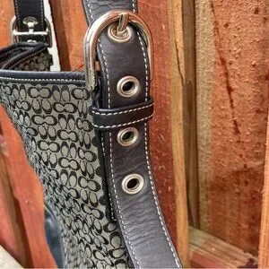 Stylish Coach shoulder bag. Features a black and gray pattern. Perfect for everyday use.