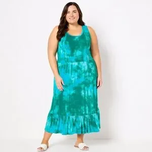 Channel effortless style and all-day comfort in this vibrant turquoise and teal tie-dye midi dress by Jason Wu. Made from an ultra-soft stretch jersey blend, this sleeveless stunner features a flattering scoop neckline and gently smocked side panels for a custom-contouring fit. A ruffled hemline adds a breezy, feminine touch that moves with you, whether you’re dressing it up for a getaway brunch or pairing with sandals for a chic everyday look.