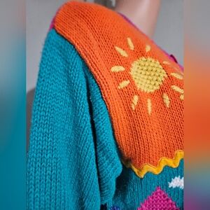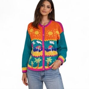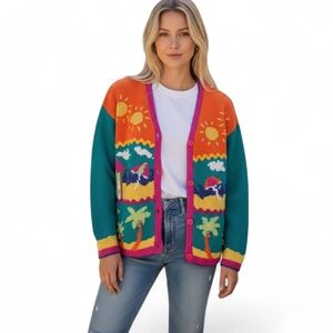 Bold, cheerful, and impossible to miss — this vintage hand knit cardigan features a vibrant beach scene complete with suns, ocean waves, surfboards, palm trees, and bright contrast trim.