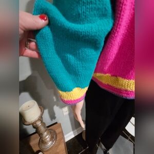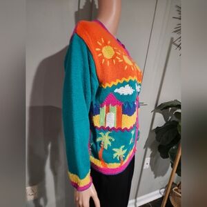 vintage sweater, novelty knit, 80s vintage, 90s retro, beach scene sweater, coastal vibe, dopamine dressing, maximalist style, statement cardigan, art teacher aesthetic, resort wear, colorful knit, retro graphic, handmade look, bold vintage, cottagecore, grannycore, grandmacore