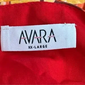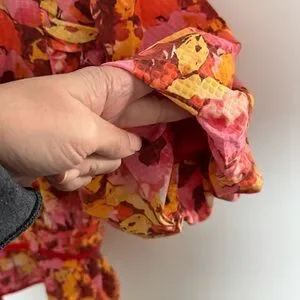 Design: The top has a bold floral print in shades of orange, yellow, and pink, accented by red piping.
