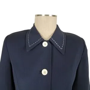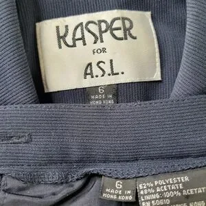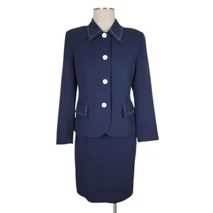 Kasper ASL Skirt Suit 6 Navy White Thick Stitch Flap Pockets Ribbed Long Sleeve