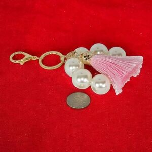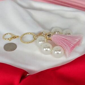 NWOT Faux chunky white pearls strung securely in a circle, pastel pink tassel, gold tone hardware; key ring and large lobster claw clasp
