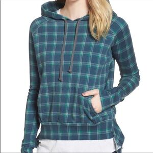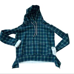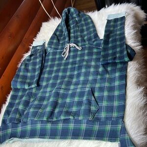 Frank & Eileen Tee Lab plaid hoodie in blue and green colors. It is a pullover style with a hood and is described as being in a distressed or pre-owned condition in many listings.