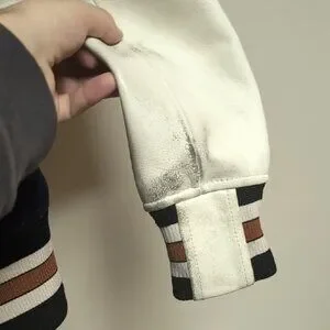 Elevate your style with this classic navy and white bomber jacket. Perfect for a sporty and casual look.