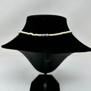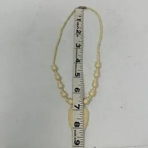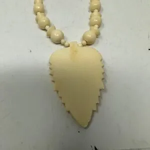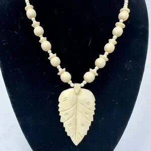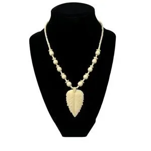 Vintage 70s Carved Bone Beaded Leaf Pendant Necklace Tribal Cream