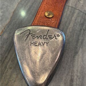 Fender Heavy belt buckle shaped like a guitar pic. Buckle in good used condition. Belt is size 38 and well loved.