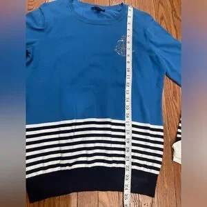 Classic blue sweater with white stripes. Features embroidered logo. Ideal for casual wear.