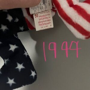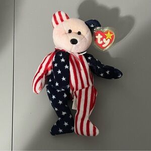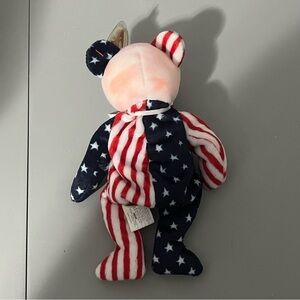 The bear has a patriotic design with red and white stripes and blue with white stars